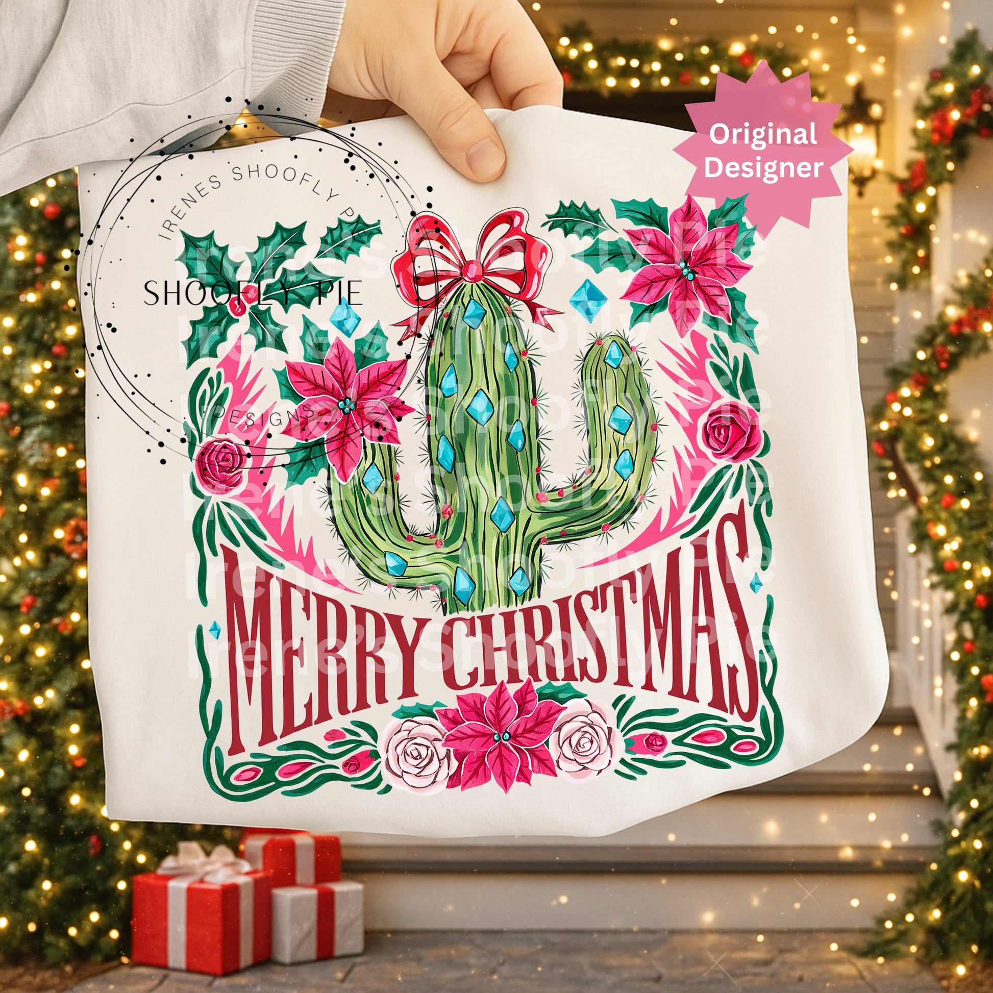 Merry Christmas Cactus PNG | Western Christmas Sublimation Design | Southwest Holiday Shirt Design | Poinsettia Cactus Clipart